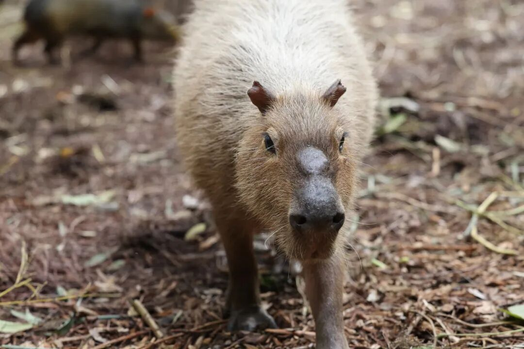 到了夜间,冬至又有了新动作!她竟从荔枝木栅栏最下方的缝隙里钻了过去,径直走向想想的区域。察觉到“入侵者”的想想立刻迎了上去,两只水豚很快发生打斗,冬至在对峙中处于下风,没过多久便退回了自己的区域。