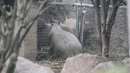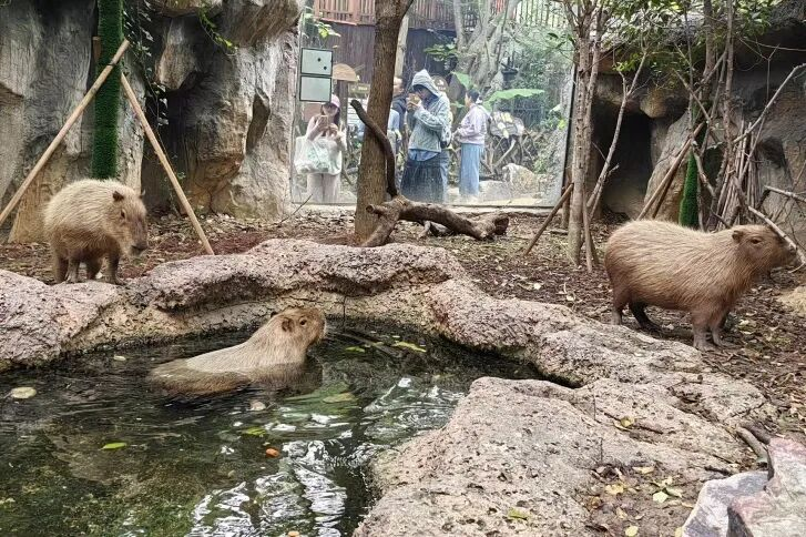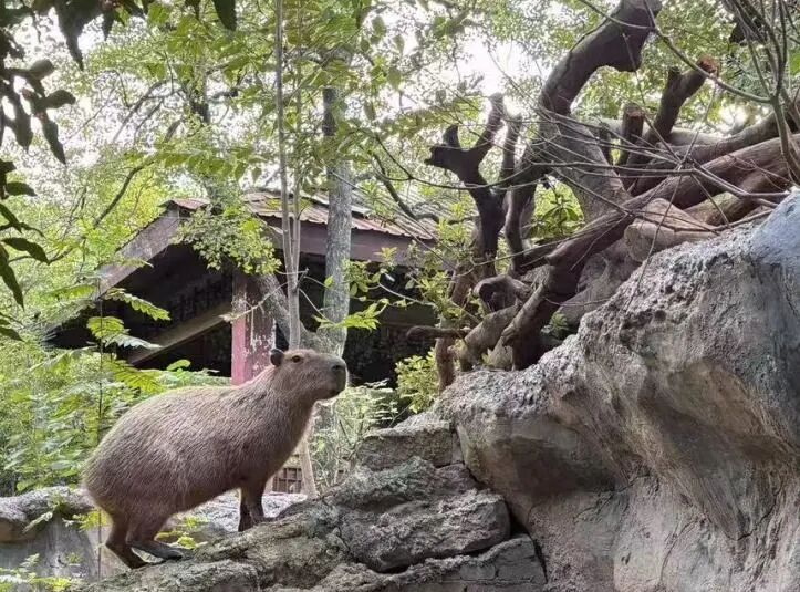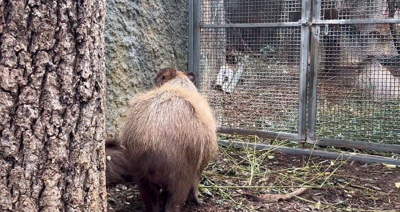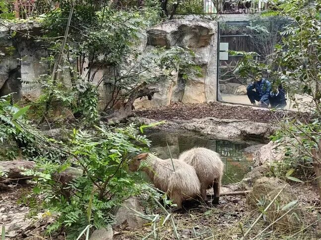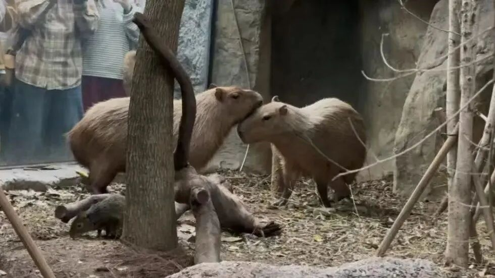 一切就绪后,分开计划按部就班推进。考虑到水豚作为群居动物对亲属和熟悉环境的依赖,饲养员没直接彻底隔离,而是先将铁门虚掩半扇,让他们逐渐适应场地的改变;再关上另一扇门,让他们一家三口轮流在隔断两侧的区域居住,让乐乐和美美陪着冬至慢慢熟悉新领地的边界,一点点降低对“原生家庭空间”的依赖。