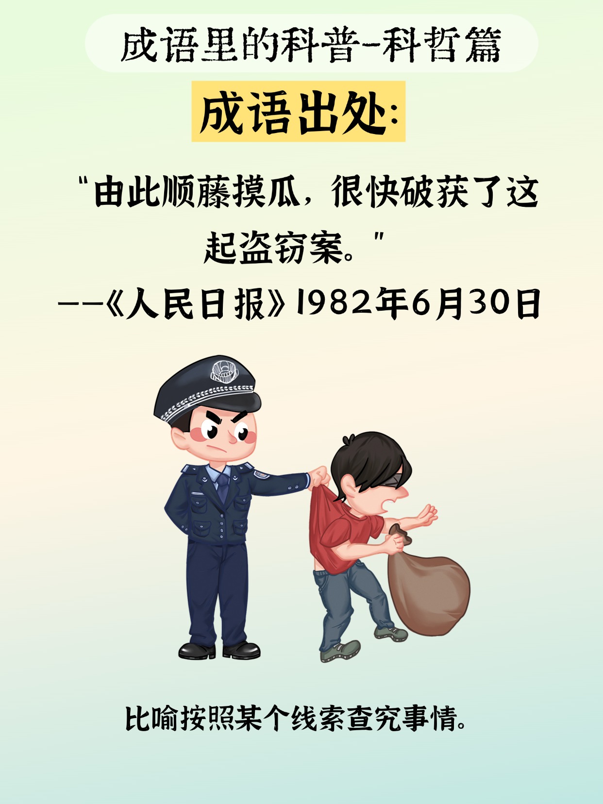👮顺藤摸瓜,这个成语出自1982年6月30日的《人民日报》:“由此顺藤摸瓜,很快破获了这起盗窃案。”讲了两个盗窃犯以收购废品为由销赃,却被公安机关以收购站为线索捉拿归案的案例。现在,它用于比喻按照某个线索查究事情。