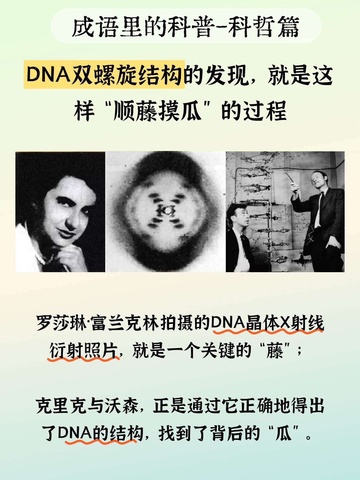 片,就是一个关键的“藤”,而抓住了这条线索的克里克与沃森,正是通过它正确地得出了DNA的结构,找到了“藤”背后的“瓜”。