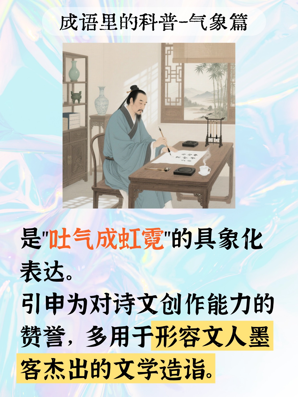 古人看天有自己的诗意和智慧,“虹霓吐颖”就是其中一个让人过目不忘的词。它的画面是这样的——雨后的天空上,彩虹横跨天际,像一柄从云端拔出的利剑。这里的“虹霓”是彩虹和霓虹的总称,“吐颖”里的“颖”是谷穗抽出的尖芒,比喻光芒或锋芒毕露,组合在一起,就是彩虹像长矛一样破云而出。现在引申为对诗文创作能力的赞誉,多用于形容文人墨客杰出的文学造诣。
