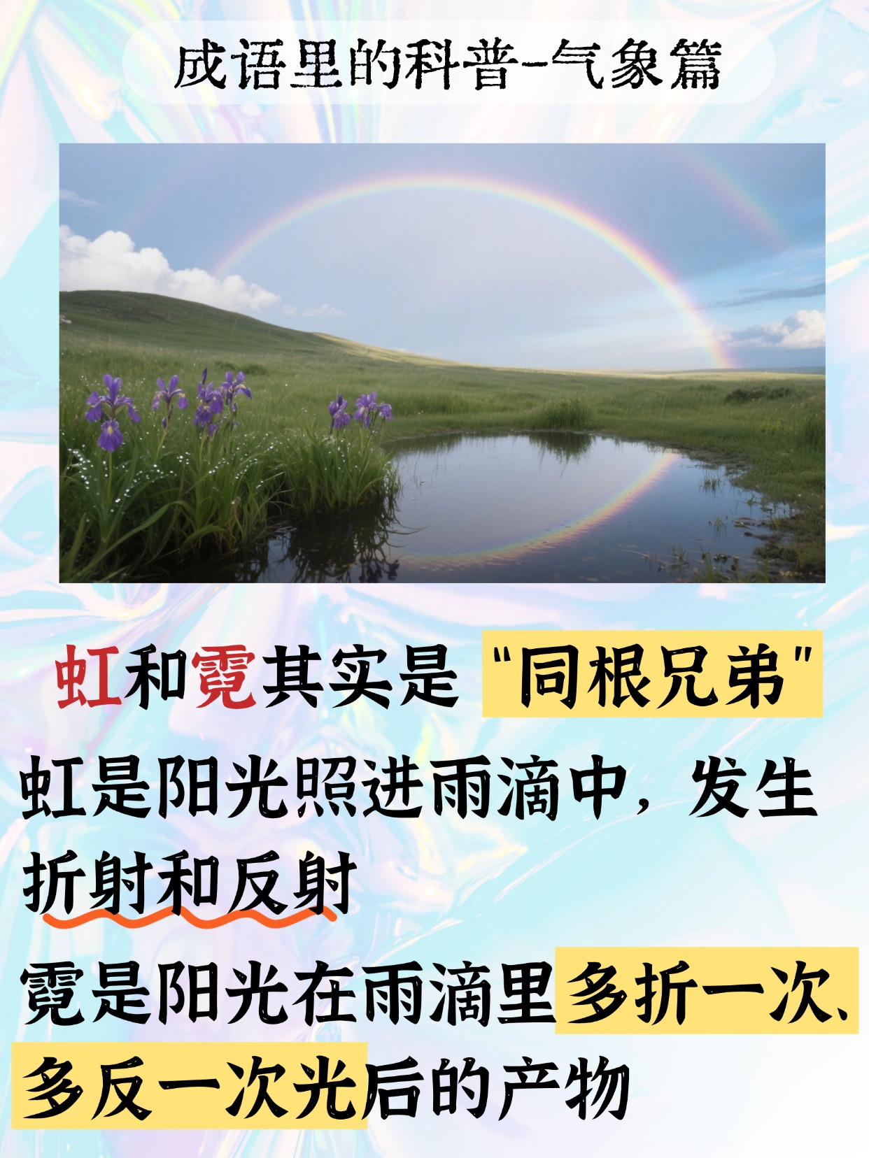 彩虹和霓其实是“同根兄弟”。阳光照进雨滴中,会发生折射和反射,把白光分解成红橙黄绿蓝靛紫的色带,这就是虹。