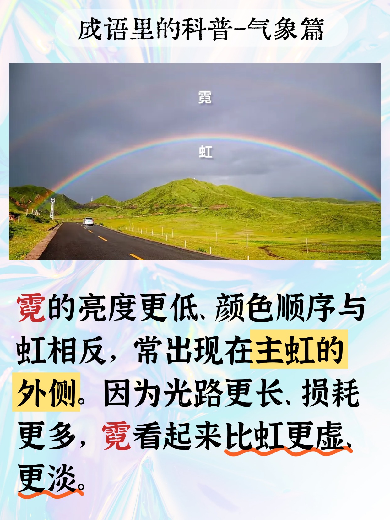 而霓是阳光在雨滴里多折一次、多反一次光后的产物,亮度更低、颜色顺序与虹相反,常出现在主虹的外侧。因为光路更长、损耗更多,霓看起来比虹更虚、更淡。