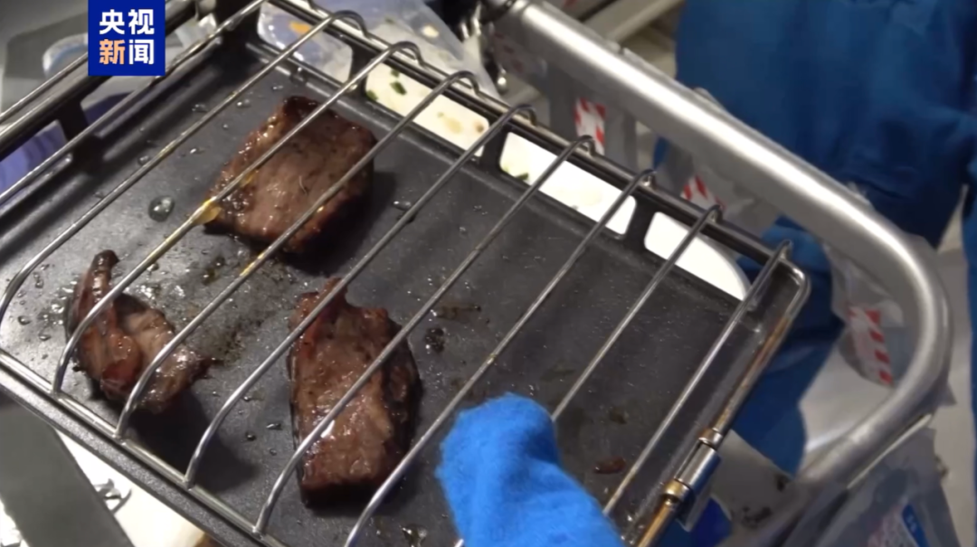 神舟二十一号航天员在烤牛排(图片来源:央视新闻)