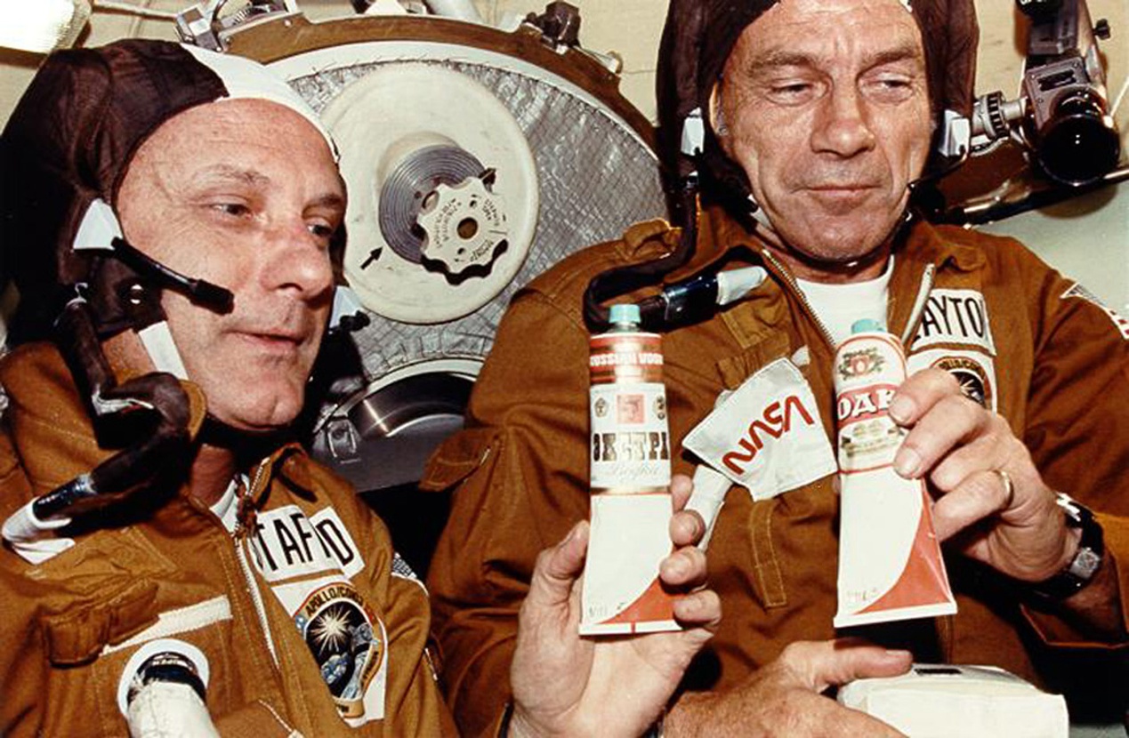 美国阿波罗飞船与原苏联联盟号飞船在太空对接后,美国航天员进入联盟号飞船座舱,品尝“牙膏式”食品(图片来源:NASA)