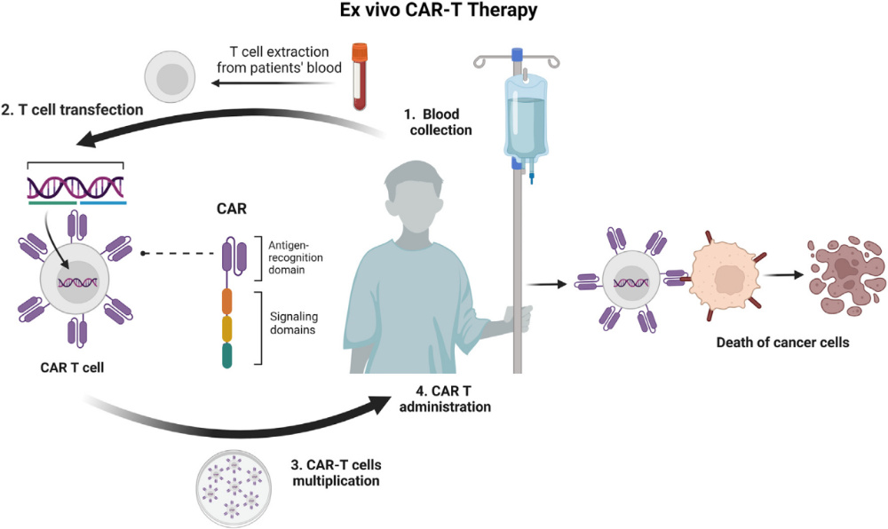 图1 体外CAR-T细胞疗法示意图。通过白细胞分离术从患者或健康供体体内分离出T细胞,再利用针对特定癌症抗原设计的嵌合抗原受体(CAR)构建体,对这些T细胞进行基因修饰。随后,对这些修饰后的T细胞进行培养和扩增,再回输至患者体内。激活后的 CAR-T 细胞能够识别并杀伤表达靶向抗原的癌细胞,且有望为患者提供针对癌症复发的长期免疫保护。图源:参考文献[15]
