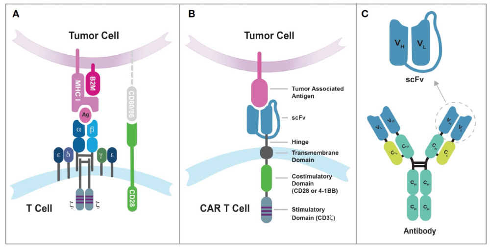 图2 传统 T 细胞受体(TCR)与人工合成嵌合抗原受体(CAR)在肿瘤抗原识别中的差异。图源:参考文献[1]