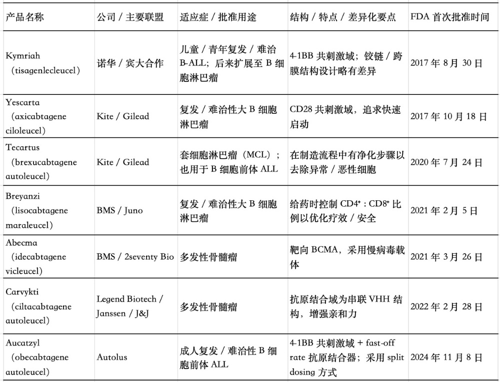 表2 截至 2024 年 FDA 已批准CAR-T 产品。作者整理