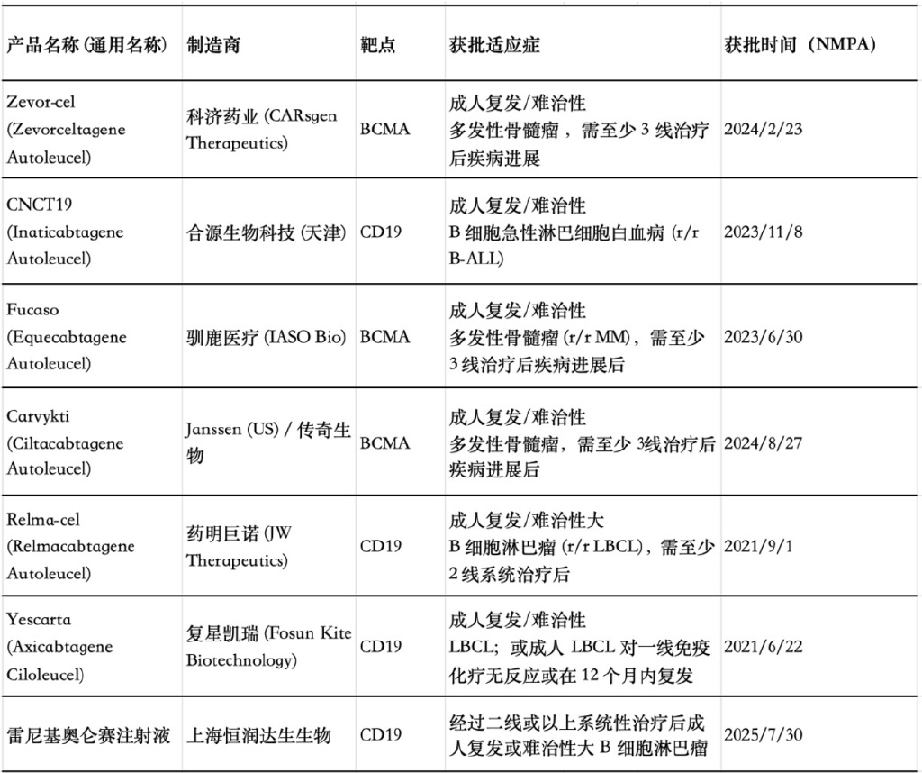 表3 截至 2025年11月中国 CAR-T 产品获批情况。整理自参考文献[5]