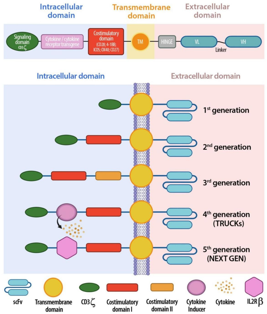 图4上图:CAR-T 细胞结构迭代示意图:包含胞内结构域、跨膜结构域和胞外结构域。下图:五代 CAR 的演变过程:从仅含一个激活结构域的第一代 CAR,到旨在提升安全性和有效性的最新一代(下一代)CAR。图源:参考文献[16]