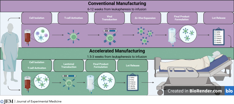 图 4 自体 CAR-T 细胞制备流程示意图。包含五大核心步骤:初始细胞分离、T 细胞活化、CAR 转基因(或 mRNA)导入、细胞扩增及最终制剂制备。图源:参考文献[9]