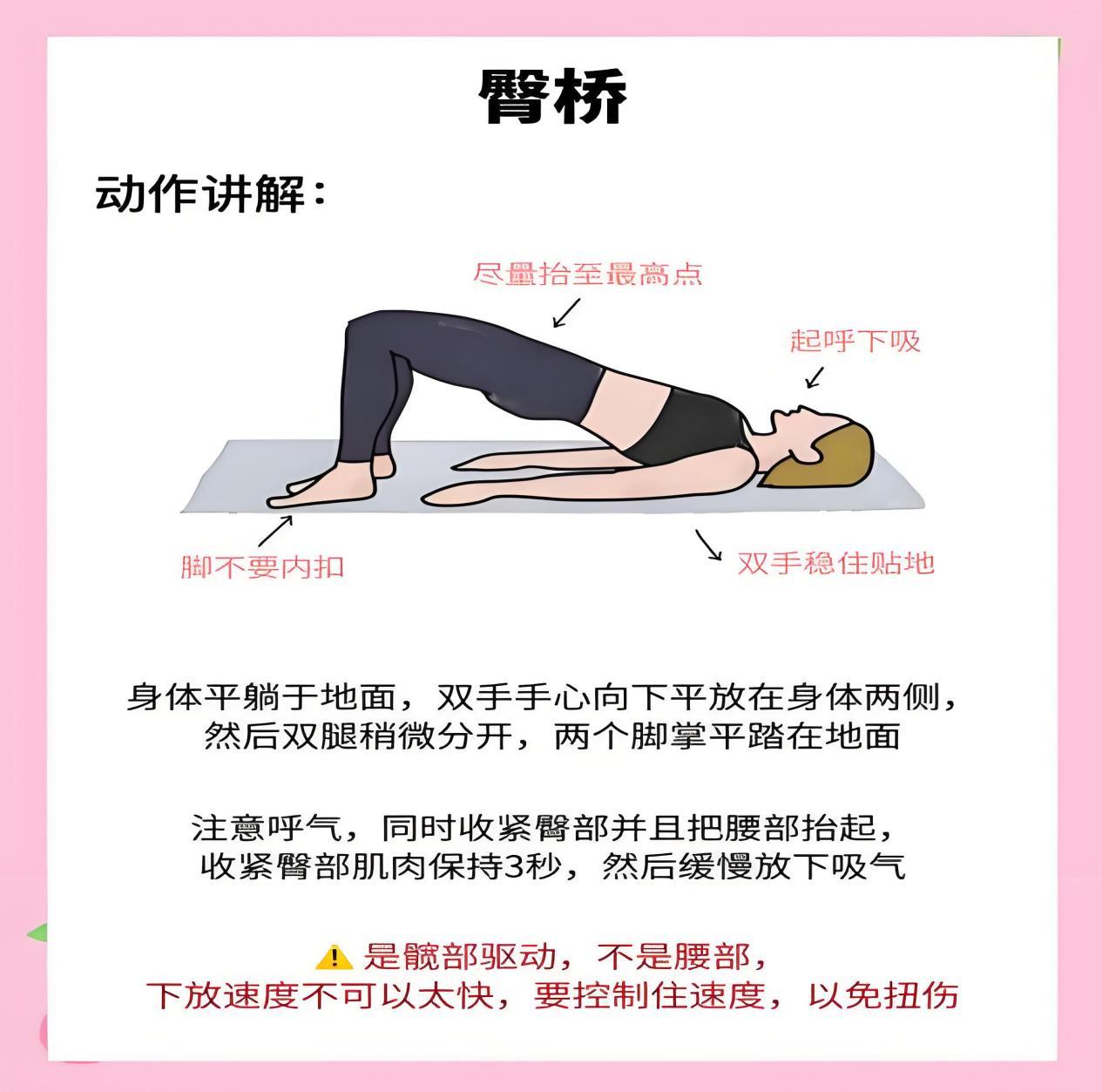 臀桥锻炼:仰卧,膝盖弯曲,两腿分开,臀部向上提,腹部肌肉收紧,在落地前坚持3-5秒钟。一天做两-三组,每组做10-12个。可同时训练髋部的肌群,加强身体的稳定。