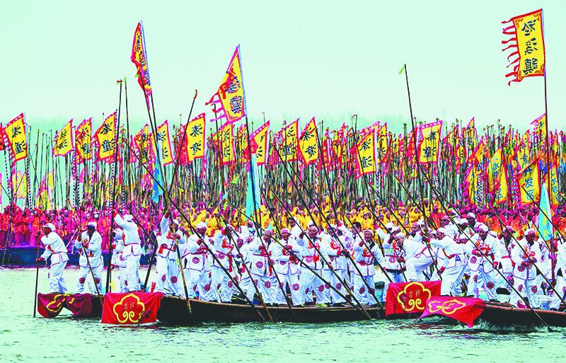 清明时节的溱潼会船节,堪称古镇最为盛大的狂欢。相传,溱潼会船节为祭奠阵亡将士和水神而设,绵延九百年,已入国家级非遗名录。溱湖之上,千蒿林立,万桨齐飞。装饰华美的贡船、蒿子船、划子船云集湖面,蒿子船如蛟龙破浪,桡手们赤膊的脊背闪着古铜色的光泽。船头老者击鼓的节奏,与岸上锣钹声交织成一曲曲磅礴乐章。青壮汉子们立于蒿子船之上,吼声震天,船行似箭离弦,刺破万顷碧波。岸上观者如涌,锣鼓喧天,呐喊助威声浪直冲云霄。当贡船上的鎏金龙旗掠过水云楼,人们仿佛看见南宋义军战船旌旗蔽日,似闻“忠魂不灭”的嘶喊穿越历史时空。溱潼人骨子里那份与水共生、同舟共济的悍勇与豪情,在此刻被演绎得酣畅淋漓。