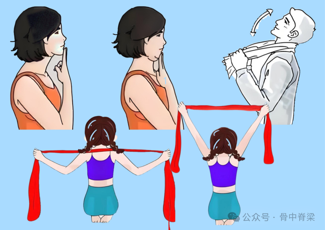 颈深肌激活:仰卧收下巴,用毛巾对抗头部做点头动作(每天3组,每组10次);