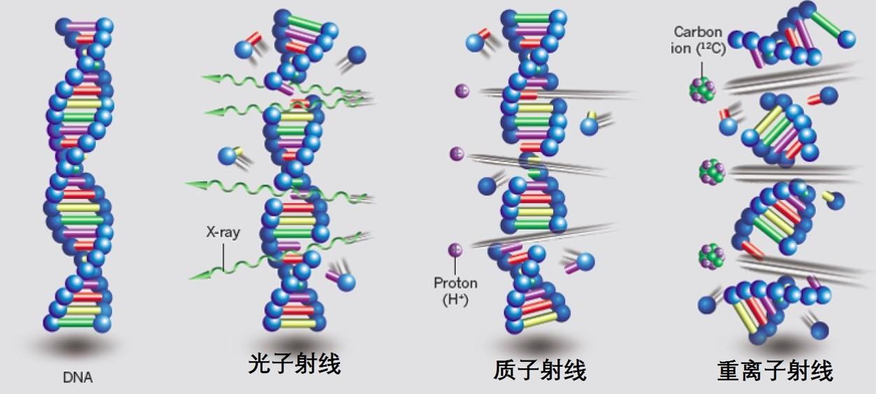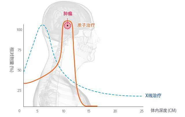 由于癌细胞分裂率高,修复受损DNA的能力低,其DNA特别容易受到攻击,所以质子治疗瞄准肿瘤细胞的DNA进行精准打击。当DNA上的大量基因被破坏到无法修复时,肿瘤细胞就会停止分裂或死亡,起到治疗肿瘤的效果。与传统的放射治疗相比,传统射线在照射途径中全程分散释放能量,使得处于肿瘤之前和之后的正常组织也受到大剂量的照射,患者会发生呕吐、眩晕、恶心、组织机能损伤甚至继发肿瘤,而质子治疗利用质子直线加速,质子束在照射路径末端才释放大部分能量,即质子束进入人体后释放极低剂量,到达肿瘤区域后辐射剂量迅速增加,形成峰值即“布拉格峰”,并释放剩余剂量。布拉格峰可以准确瞄准并杀死癌变细胞且不损伤周围正常组织,从而达到良好的治疗效果。