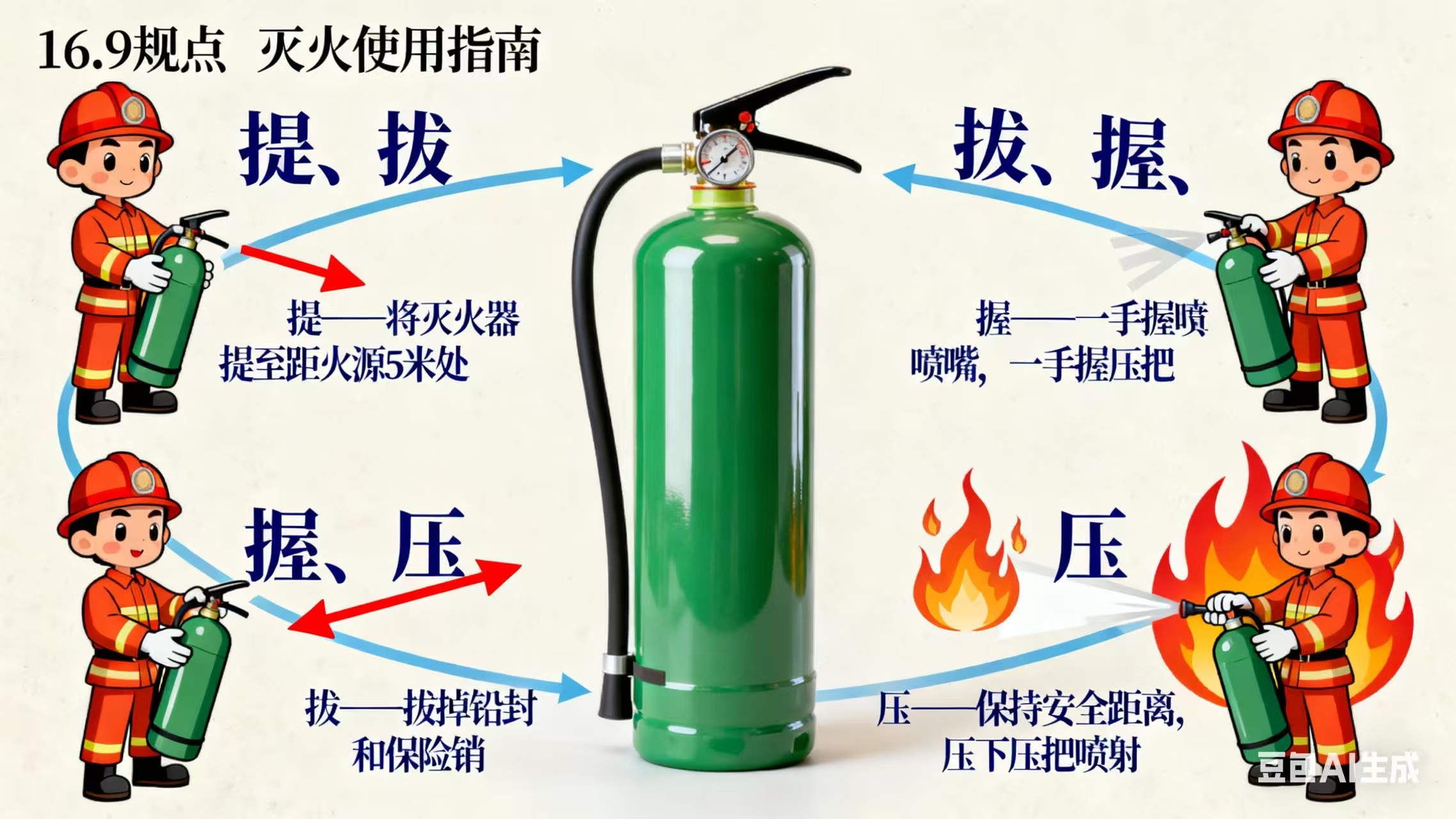 4. 压:用力按下压把,干粉(或其他类型灭火剂)会自动喷出,同时左右摆动喷嘴,均匀覆盖火源区域,直至火焰完全熄灭。