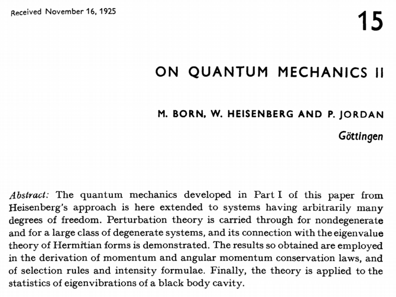 1925年9月,海森堡发表了《关于运动学与力学关系的量子论重新诠释》(参考文献[1])。论文极为艰涩,当时几乎无人能看懂。连泡利都调侃说:“我完全不知道你写了些什么。” 但玻恩看到了它的潜力,很快与海森堡、约尔当合作,发表了更系统的“B-H-J”论文(参考文献[2])。这篇文章首次完整建立了矩阵力学的结构,量子力学终于有了坚实的数学支柱。
