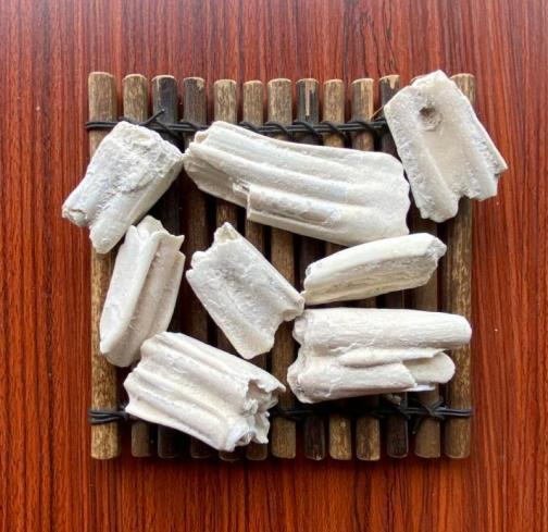 龙骨是最广为人知的药用化石,其来源广泛,多为哺乳动物如三趾马、犀类、鹿类、象类等的骨骼化石。它的性味甘、涩、平,炮制分生用与煅制两种,生用具有镇惊安神、平肝潜阳、收敛固涩等多种功效,经加热煅制后的煅龙骨常用于治疗遗精、崩漏、多汗症等病症。
