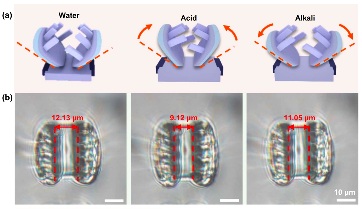 (a)、(b) 分别为手形微型机器人 pH 响应模块在酸性与碱性环境下的示意图和光学图像。该模块类似于“手掌”结构,在酸性溶液中闭合,加入碱性溶液后则张开。