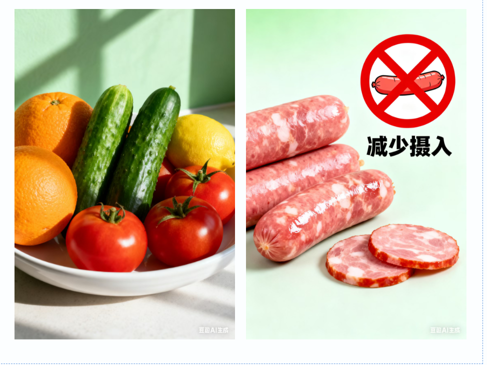 建议多吃新鲜蔬果,其富含的抗氧化剂有助修复细胞;同时应减少香肠、火腿等加工肉制品的摄入,以降低潜在致癌风险。