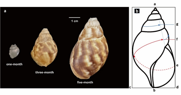 (a)实验室培养的不同⽣⻓阶段的⾮洲⼤蜗⽜(Achatina fulica);(b)蜗⽜壳体形态参数测量示意图。