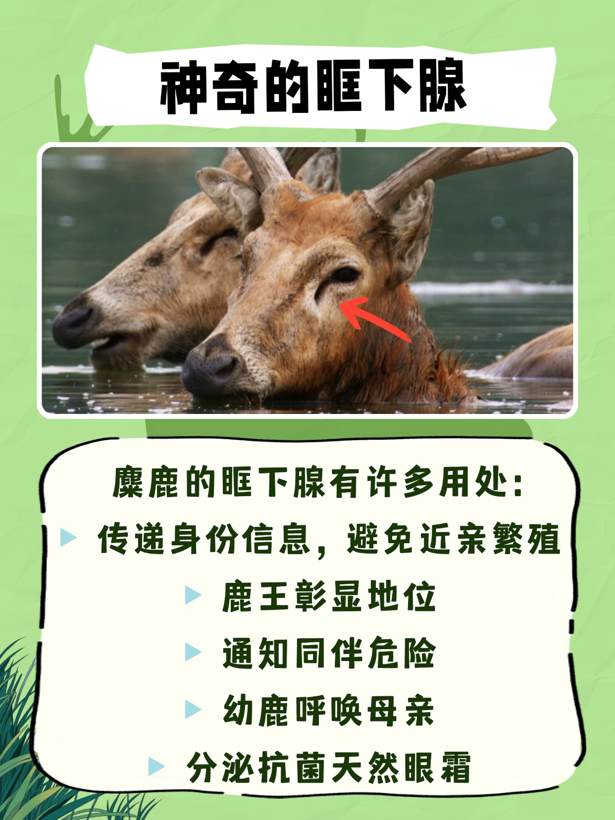 眶下腺并非麋鹿独有,鹿科动物(如梅花鹿、马鹿)都有,但麋鹿的腺体更显著,可能与湿地生活需求有关。