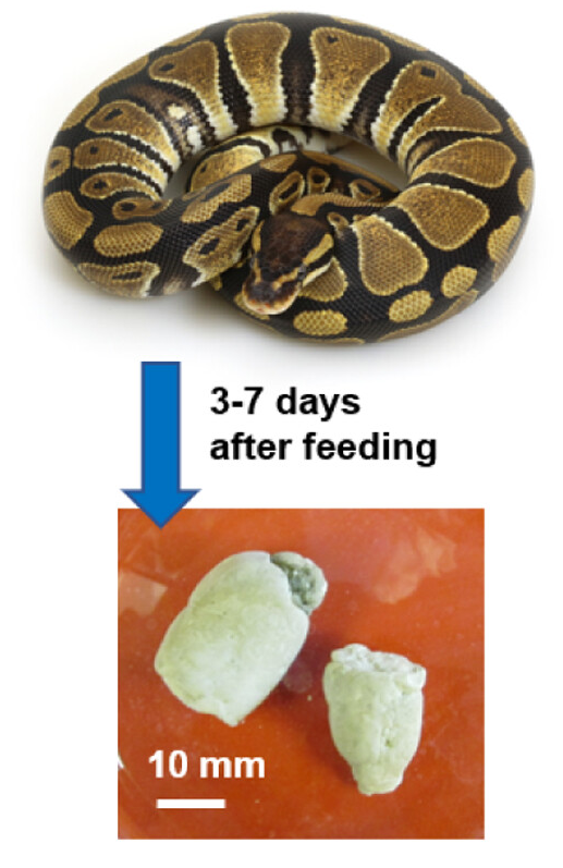 乔治城大学研究团队对二十多种爬行动物的排泄样品进行分析发现,不论是蟒蛇、树蟒,还是巨蜥,它们排出的固体废物都含有相似的结构单元,直径约1到10微米的球状颗粒。这些微球由尿酸单水合物纳米晶体构成,形态规整且具有高度稳定性。
