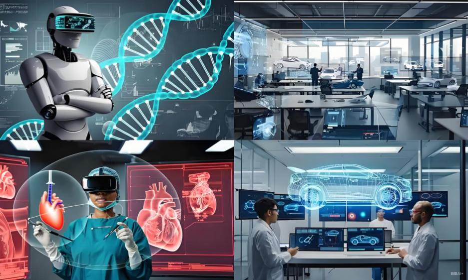 虚拟现实应用场景示意:虚拟办公(右上)、虚拟医疗(左下)、虚拟设计(右下)