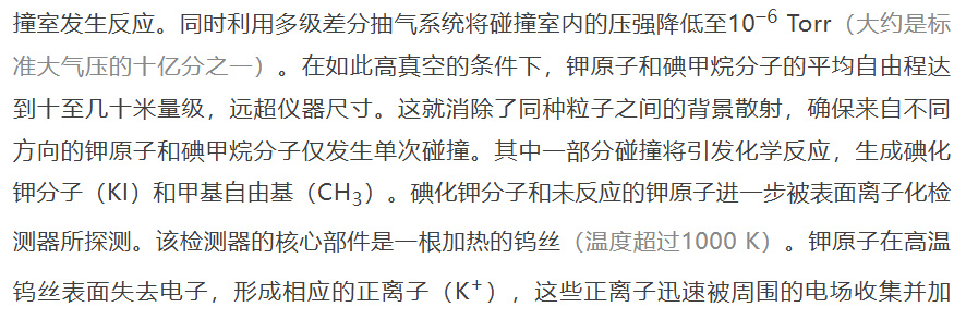 速,最终输出电流信号(碘化钾分子在高温钨丝表面会解离出钾原子,进而也被检测到)。检测器被安装在围绕散射中心转动的旋臂上,其前端配有速度分选装置,以记录不同散射角度和飞行速度的碘化钾分子和钾原子的数目。