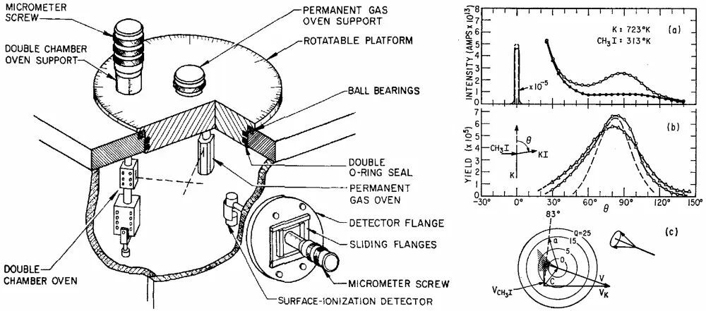 图14.(左)早期交叉分子束实验装置示意图。(右)交叉分子束实验的典型数据分析,包括(a)钾原子和(b)碘化钾分子的散射角度分布(实验室坐标系下碘化钾散射角θLAB的峰值为83度)、(c)描述反应物及其质心速度矢量的“牛顿图”(其中阴影部分表现的是碘化钾的主要散射方向)。图片来源:J. Chem. Phys.1961,34, 1842;参考文献[15]。