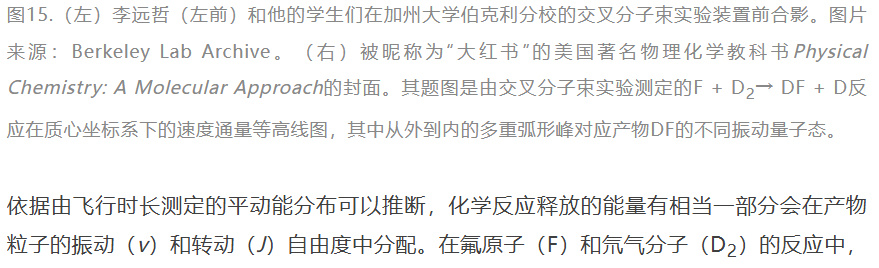 李远哲等人通过速度通量等高线图清晰地区分了产物氟化氘分子(DF)的多个振动量子态(v = 1~4)。这说明在探测和解析精度提升后,交叉分子束实验所能提供的有关化学反应过程的信息也更加丰富。1986年,赫施巴赫和李远哲由于对“基元化学过程动力学”的贡献,与约翰•波兰尼一同分享了诺贝尔化学奖。今天,交叉分子束实验技术仍在不断发展。中国科学院大连化学物理研究所杨学明、张东辉领导的团队建立了氢原子里德堡态标记等先进的交叉分子束实验探测技术,结合极高精度势能面构造和量子动力学模拟,揭示了化学反应中的量子共振现象和几何相位效应,把化学动力学实验研究提升到了前所未有的高度。