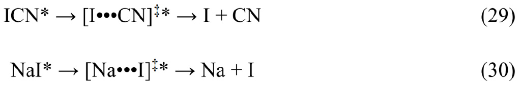 使用波长为307 nm的泵浦脉冲激发氰化碘分子,再用波长为388.5 nm的探测脉冲照射反应体系(该波长可激发产物氰基自由基(CN)),利用氰基自由基的自发辐射荧光光谱监测反应的进程。通过扫描探测脉冲的延迟间隔,发现荧光信号显著出现的时刻比反应启动滞后了205± 50 fs。如果令探测脉冲稍微红移(波长改变至389.7~391.4 nm),还能在更短的延迟间隔捕捉到一组瞬间增强而后衰减的荧光信号,这对应着氰基尚未完全摆脱碘原子束缚的一系列中间状态。在碘化钠的实验中发现,波包在离子态和共价态两个势能面的避免交叉区域附近往复振荡,可持续数皮秒。这表明钠–碘键的解离具有显著的非绝热动力学特征,不能用简单的经典图像(两个质点彼此远离)来描述。虽然这些实验中观察到的,并不是波兰尼–艾林意义下的过渡态(势能面一阶鞍点),但是飞秒激光实验终究让化学家们“看到”了化学键断裂的“慢镜头重播”!