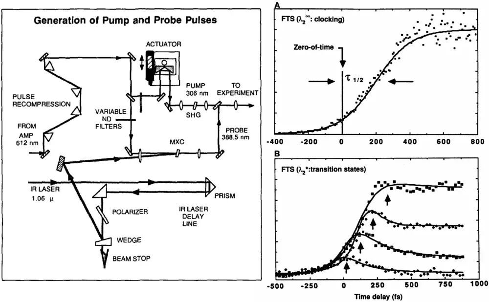是它提供了一种名为“泵浦–探测(pump–probe)”的实验思路(先用一束泵浦光脉冲照射样品,激发化学反应;在一定的延迟间隔后,用另一束探测光脉冲监测反应体系中物质结构的变化),成为后来瞬态谱学的标准技术架构。不过,一般闪光光解装置中常见的电子延迟电路无法进一步缩短延迟间隔,欲达此目的仍需另想办法。