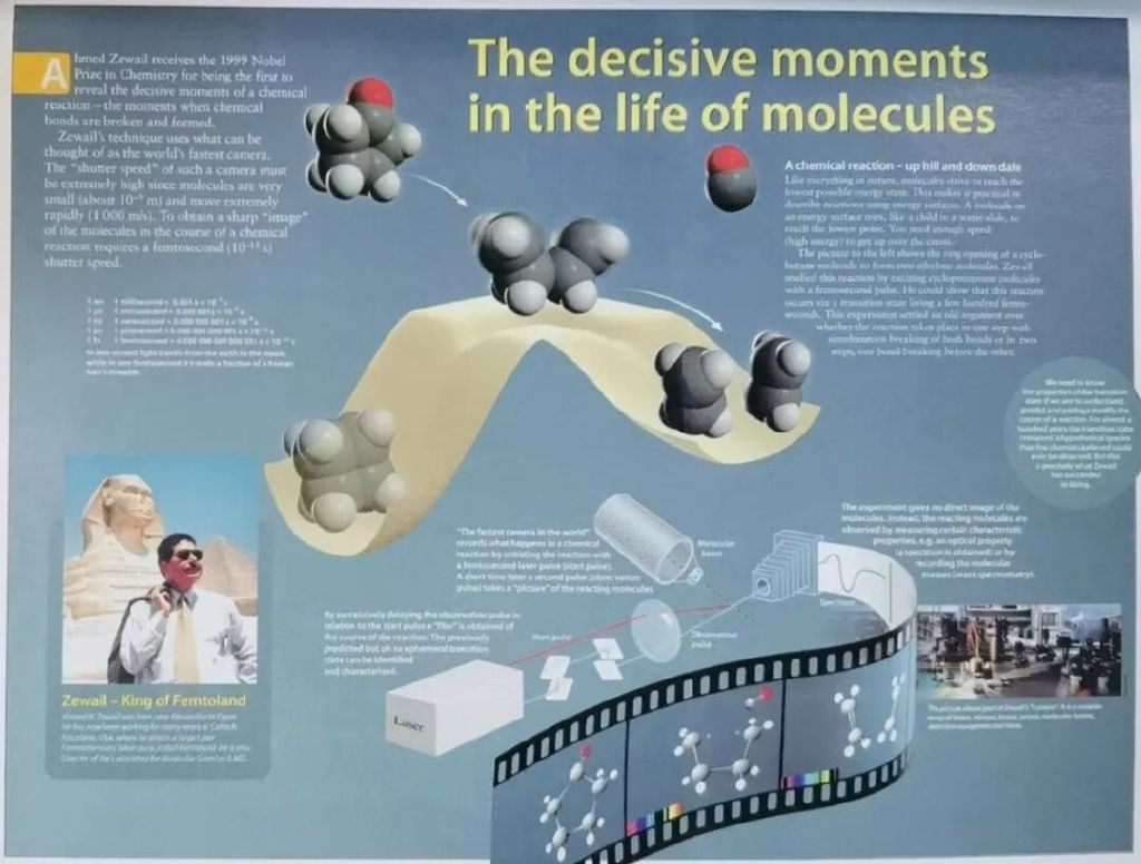 图17.泽维尔获得诺贝尔化学奖的海报“决定分子命运的瞬间”,中心部分是环戊酮脱羰产生四亚甲基双自由基的示意图。图片来源:参考文献[29]。