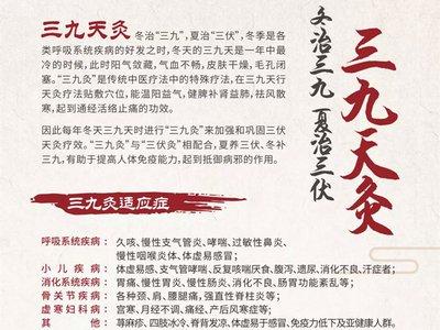 “三九补一冬,来年无病痛”。中医上认为冬季是万物闭藏的季节,也是万物为来年春天的复苏、成长积累能量的时候。冬季养生至关重要,应加大进补力度。“三九贴”是中医传统医学外治法敷贴疗法中的一种,与夏季的“三伏贴”一样,属于中医的“天灸”,它是运用人体经络循行规律、穴位功效、年历中24个节气规律和时间治疗学原理,根据人体体质情况和发病特点,选择在冬季三九天时候,通过中药药物贴敷在特定治疗作用的穴位上,达到祛除疾病、“夏病冬防、冬病冬治”的效果。对于一些虚寒性疾病有着明显的治疗作用,部分还可以达到根治的效果。