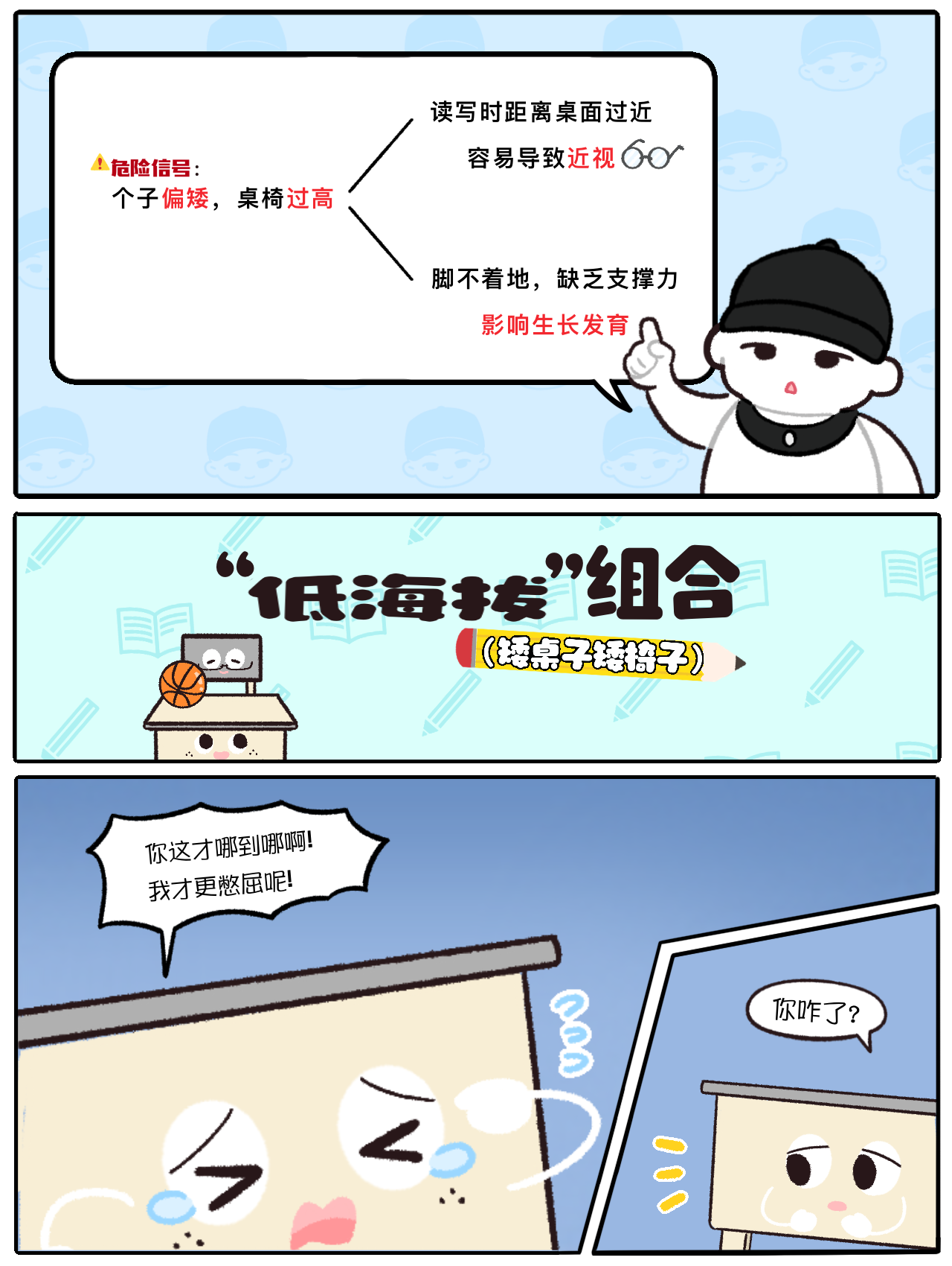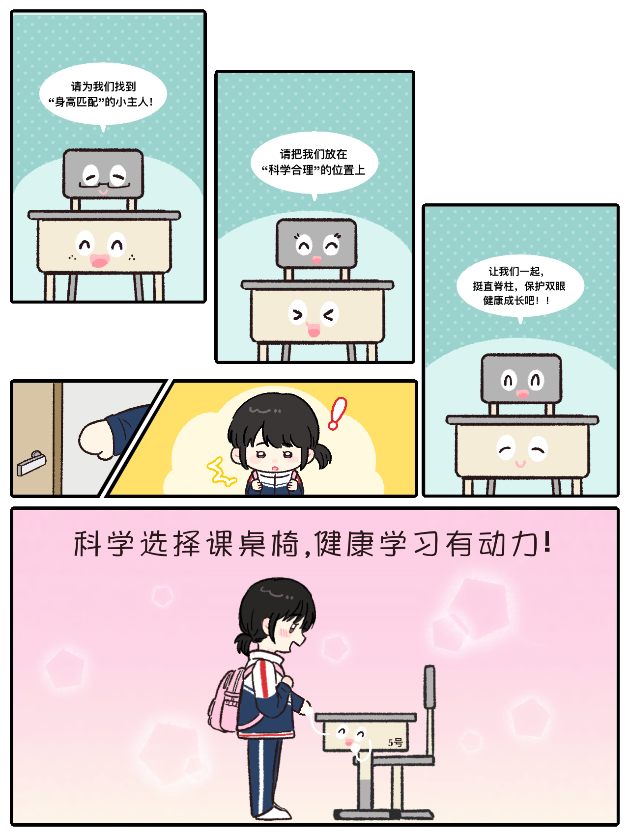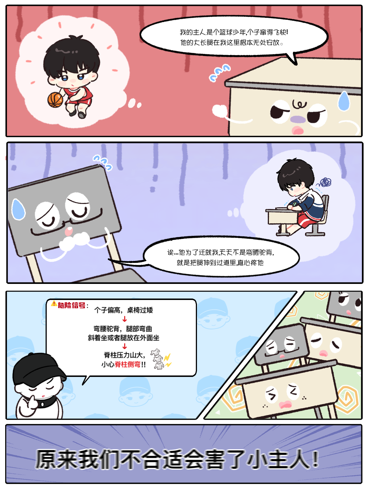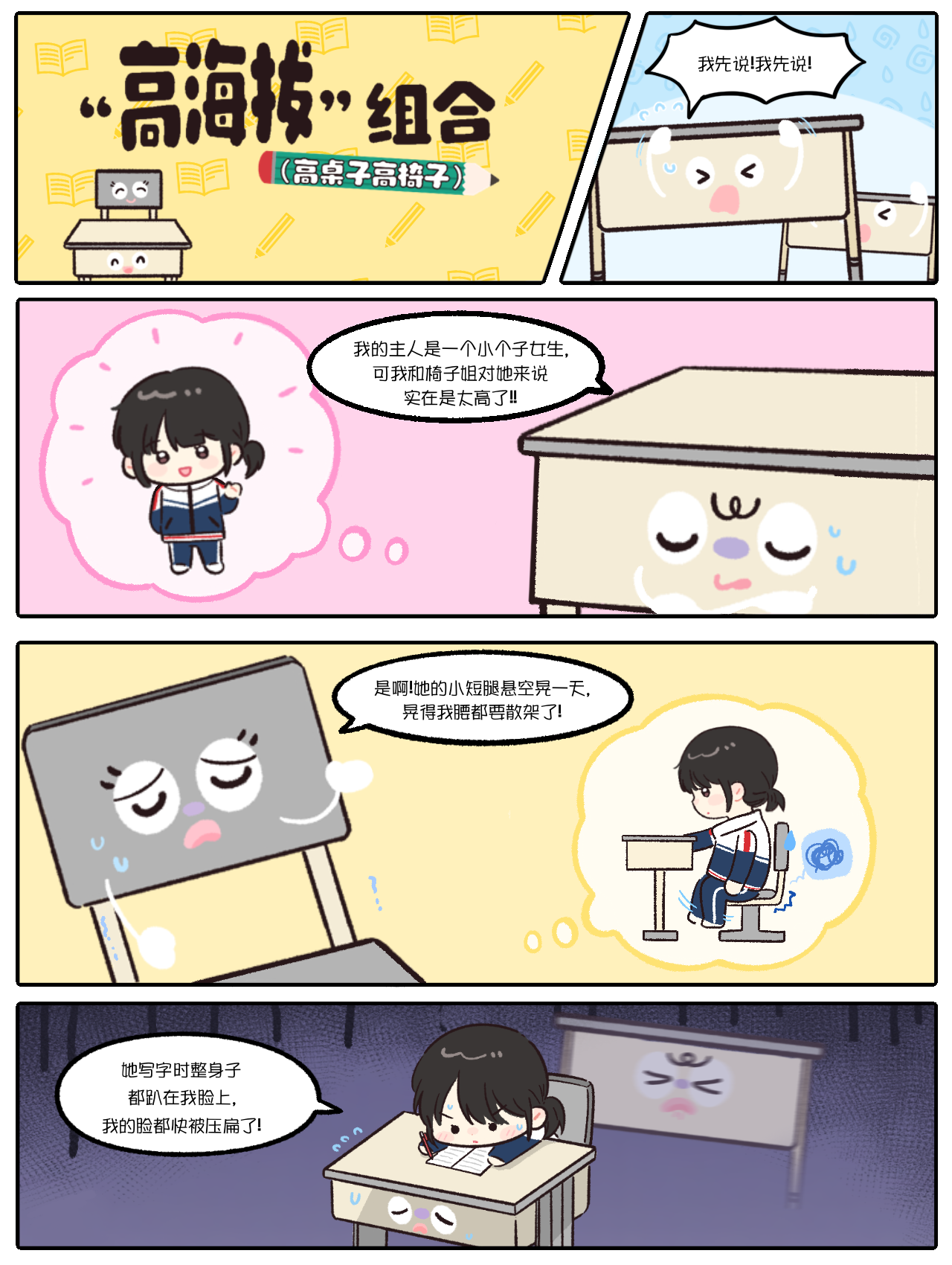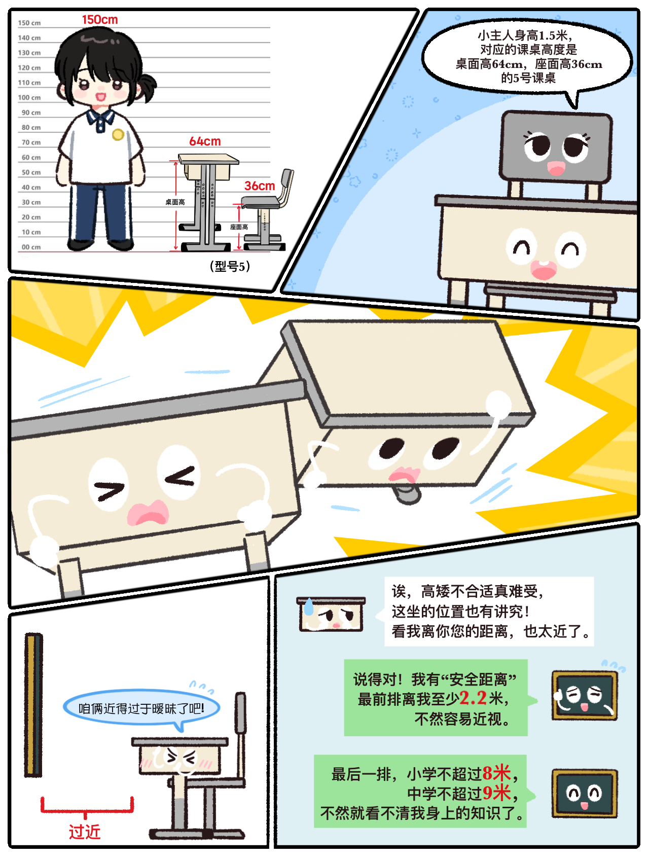 图文简介: 🌙夜深人静,教室里的课桌椅却悄悄开起了“吐槽大会”!高个子桌椅抱怨小主人脚不着地,矮个子桌椅心疼大长腿无处安放……原来,桌椅不合适竟会悄悄影响健康和视力~