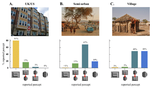他的团队分别向三组文化背景迥异的人群——英国/美国的城市居民、纳米比亚半城市化的小镇奥普沃(Opuwo)居民,以及生活在传统圆形茅屋村落的希姆巴族(Himba)人——展示了这张“科弗错觉图”,并询问他们从中看到了什么。
