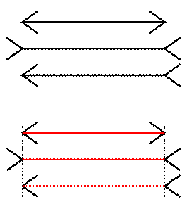 著名的米勒-莱尔错觉,上图中的三条线段在视觉上不等长,实则不然