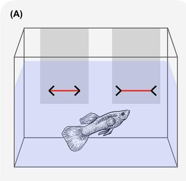 在过往实验中,科学家训练孔雀鱼选择游向实际更长的线以获取奖励。而当它们面对米勒-莱尔错觉图时,会倾向于选择“视觉上更长”的内箭头线。