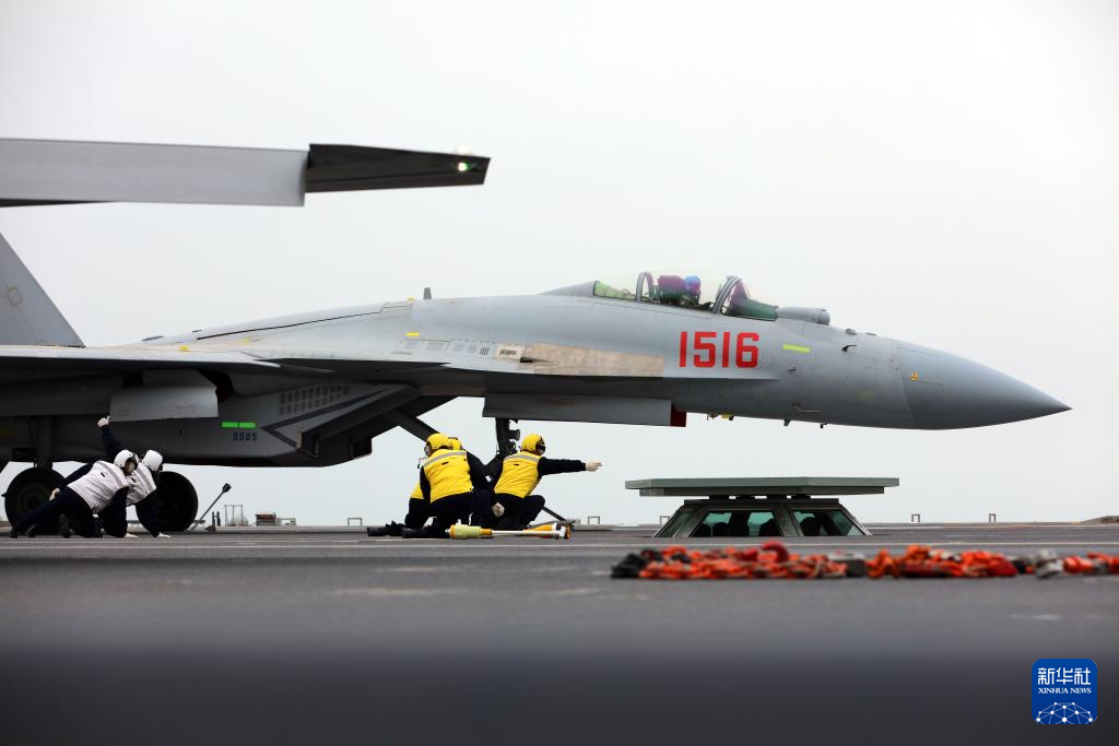 歼-15T舰载战斗机在福建舰上电磁弹射起飞,起飞助理做出放飞手势(资料照片)