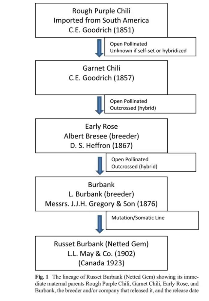 早玫瑰土豆作为亲本,赋予了布尔班克土豆优良的性状,布尔班克芽变还衍生出了另一个重要品种——赤褐布尔班克。