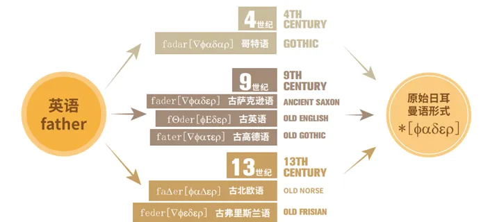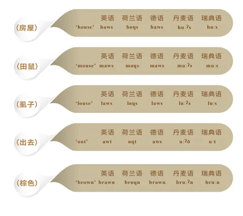这个例子中有5个不同的概念,在5种不同语言中都有相应的词来表达。我们看到,5种语言之间语音形式不同,但在每种语言中这5个词都具有相同的元音。这样,5种语言明显表现出整齐的语音对应关系。为什么会出现这种情况呢?这是因为,语音的演变是成系统、有规律的。原本相同的语言,尽管分化演变后语音形式已经不同,但有规律的演变会使不同的语音形式之间具有系统整齐的对应关系。由此可以证明,这5种语言在历史上来自同一种语言,我们称这些有共同来源的不同语言为亲属语言。上例中的5种语言都来自原始日耳曼语。