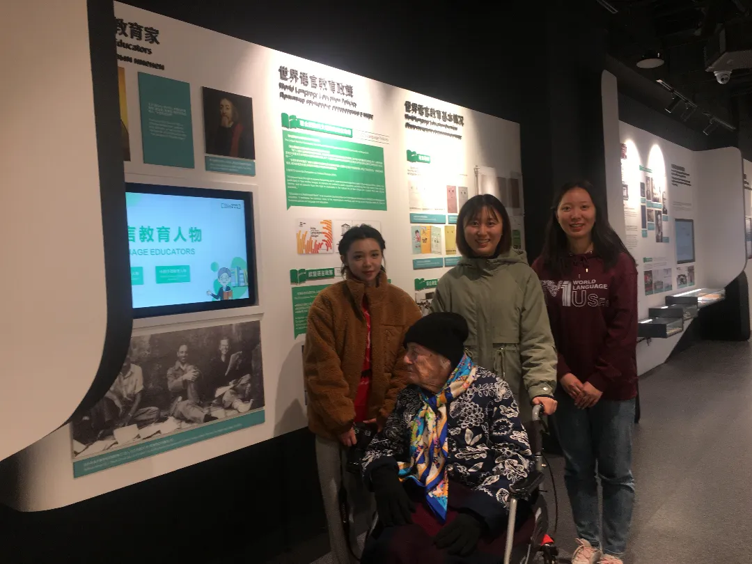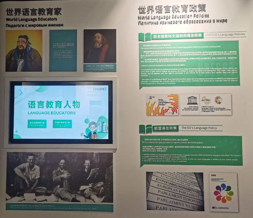 世界语言博物馆教育板块,左下角的照片是北外中央外事学校时期的韩丁(左)、大卫·柯鲁克(中)和伊莎白·柯鲁克(右)。