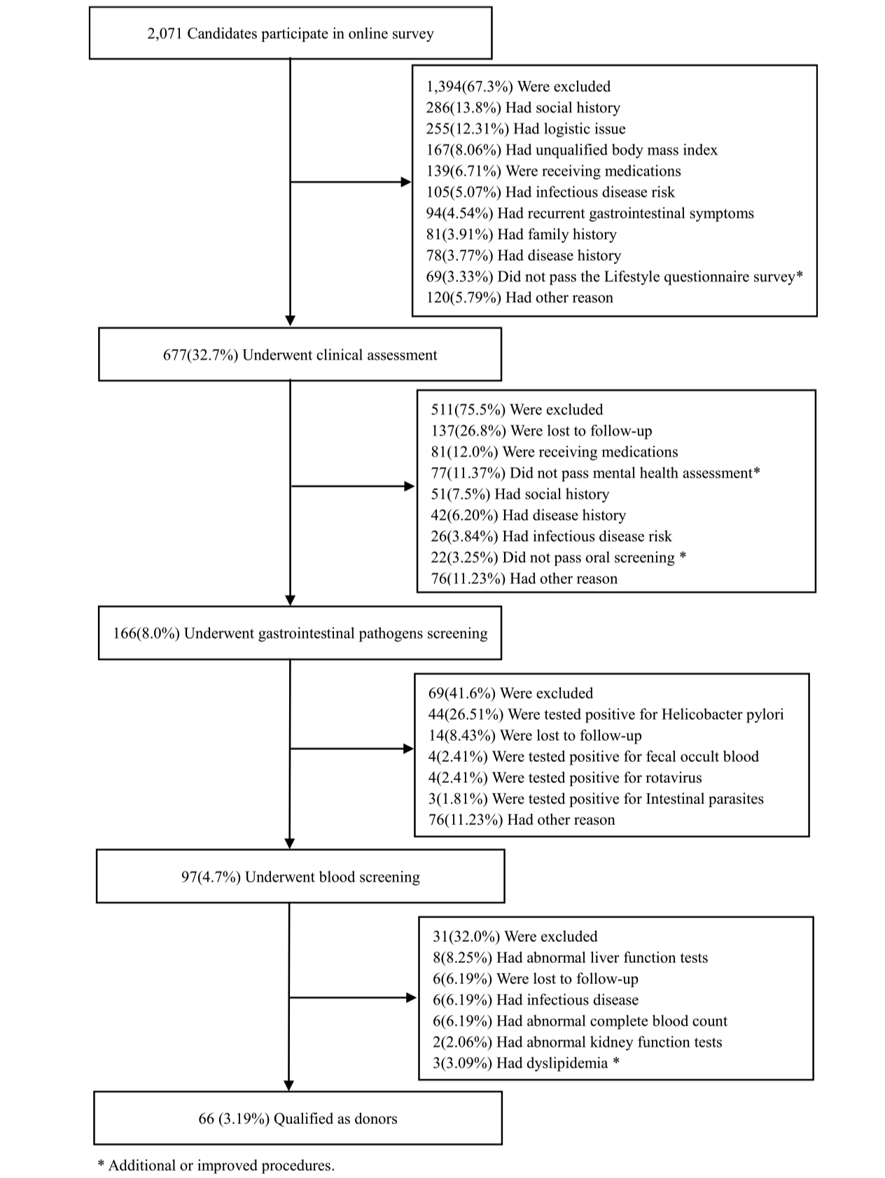 研究采用多层筛查体系:初筛、复筛、实验室检测与随访评估。最终通过率不足 5%。最常见的排除原因包括肠道炎症、代谢异常及潜在感染风险。