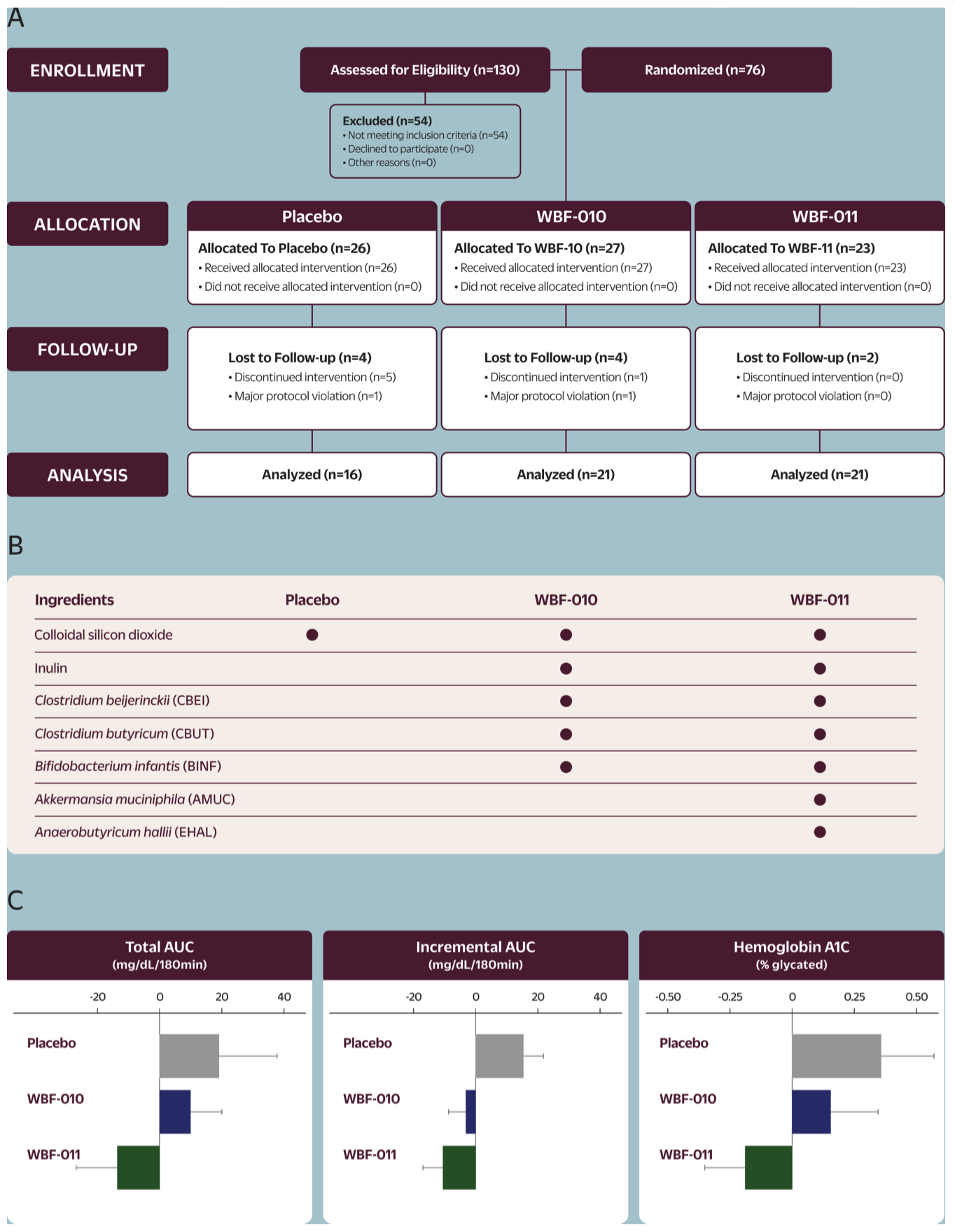他们在美国六个临床中心发起一项双盲、随机、安慰剂对照试验(注册号 NCT03893422),共招募 76 名已确诊 2 型糖尿病的成年人。这些受试者大多服用二甲双胍,有的还联合磺脲类药物。研究人员将他们随机分成三组:安慰剂组、三菌株配方 WBF-010 组和五菌株配方 WBF-011 组,每日两次,连续 12 周。在整个过程中,受试者继续原有药物治疗和饮食习惯,确保观察到的差异仅来自益生菌干预。