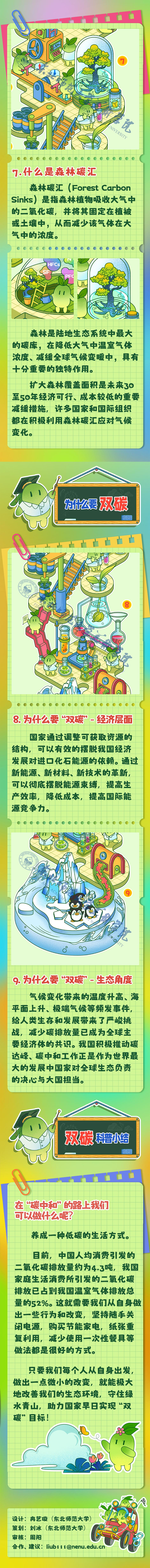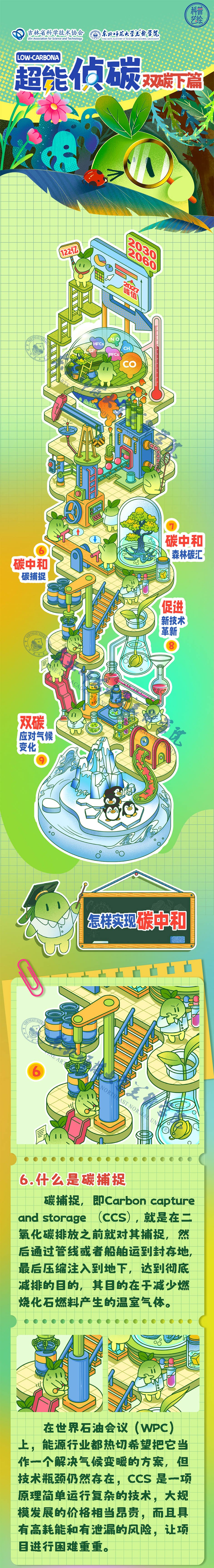 图文简介: 《超级侦碳—双碳下篇》设计作品依托于吉林省科学技术协会的实际项目。本研究以“双碳”有关于公众生活的科普内容,对其进行视觉化艺术设计,提炼其中的视觉符号,加以叙事逻辑绘制成叙事性“双碳”主题科普插画。