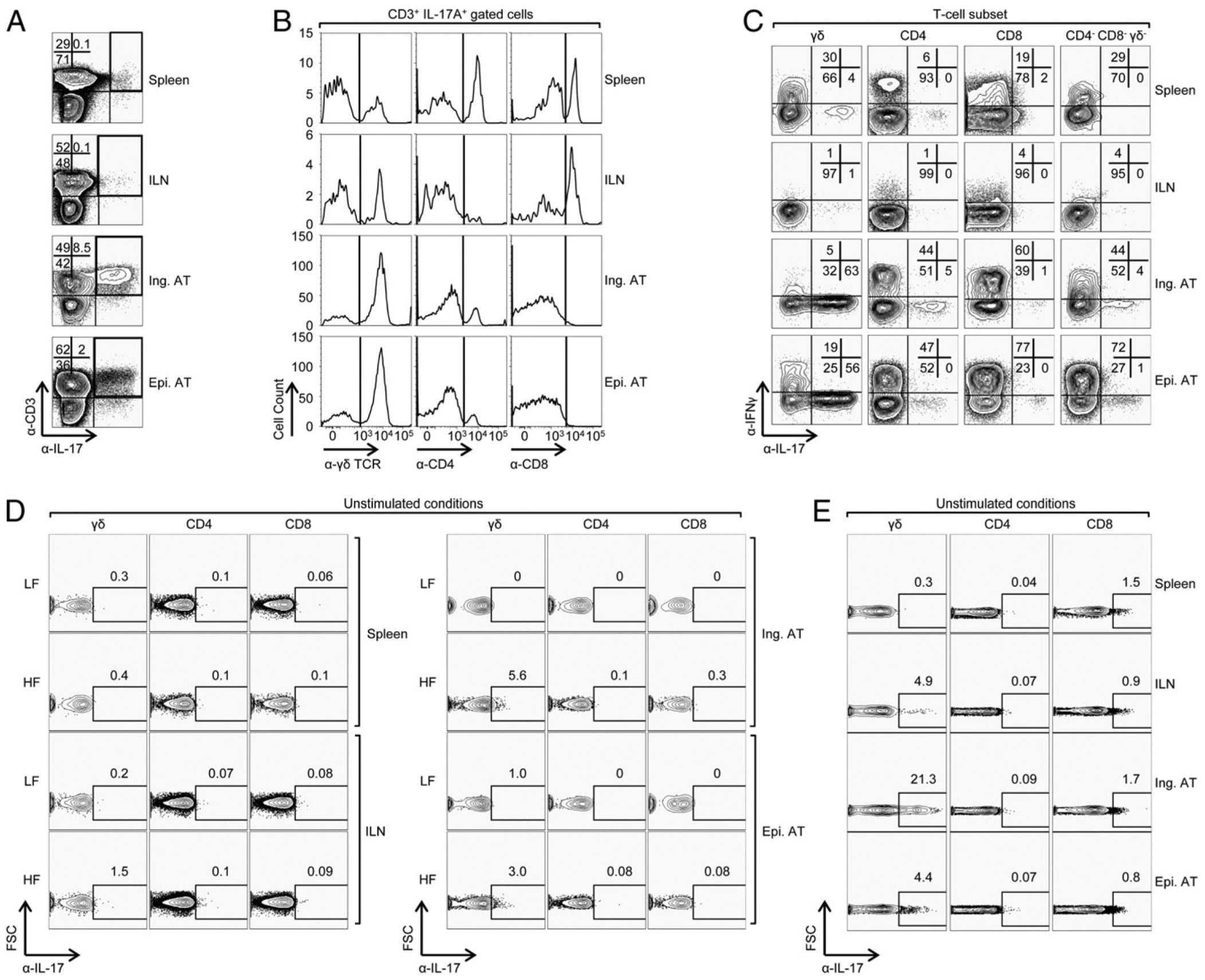 图1、通过体外刺激与自发表达检测,分析了高脂饮食小鼠脾脏、淋巴结及脂肪组织中不同T细胞亚群产生IL-17的情况。