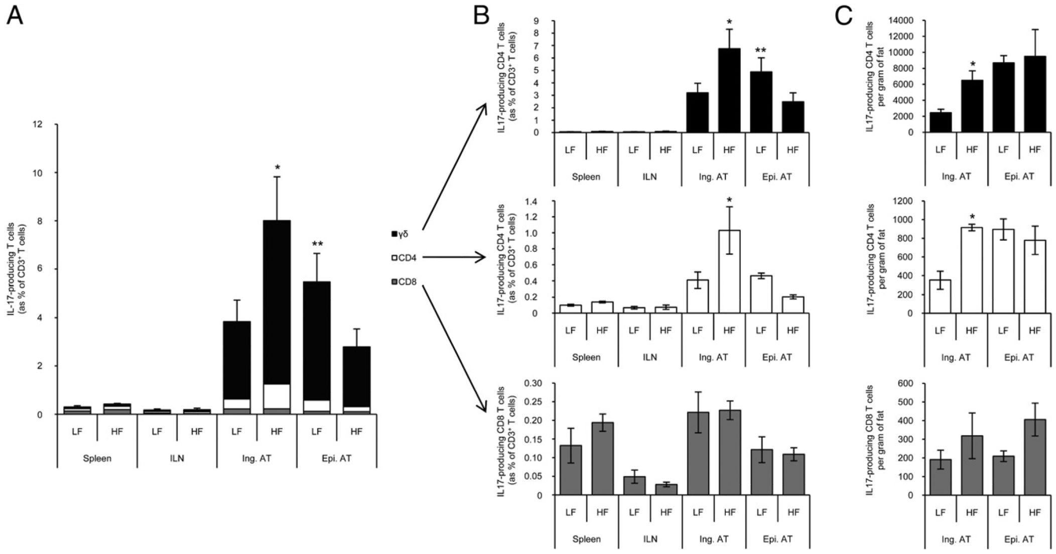 图2、该研究比较了低脂与高脂饮食喂养小鼠不同脂肪组织及脾脏中产生IL-17的T细胞亚群频率与数量,发现高脂饮食显著改变了γδ T细胞和CD4+ T细胞在脂肪组织中的IL-17表达分布。