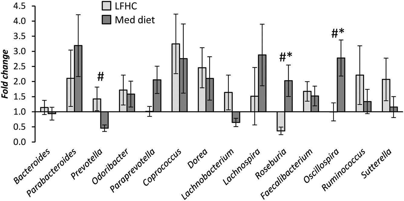 图2. 不同饮食干预一年后主要菌属的丰度变化。