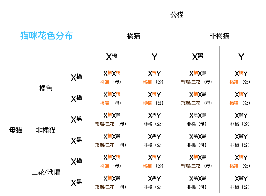 (PS:这个模型是简化过的,只讨论影响嗜铬黑色素和真黑色素的那对等位基因!影响猫是不是白的是另一些基因,例如有没有白斑基因会决定上方基因型为X橘X黑的母猫是黑白橘的三花还是黑橘相嵌的玳瑁。)